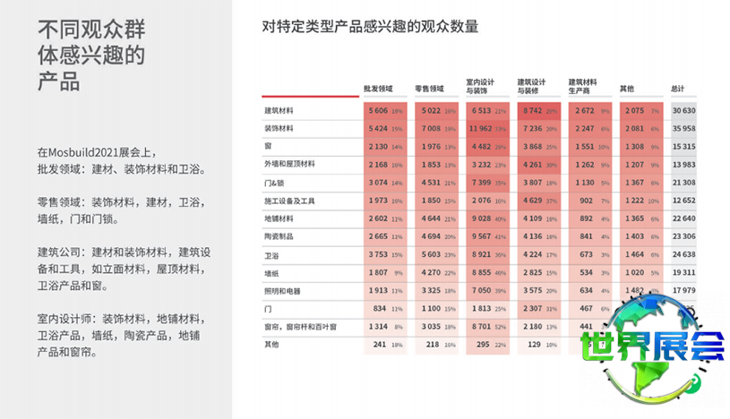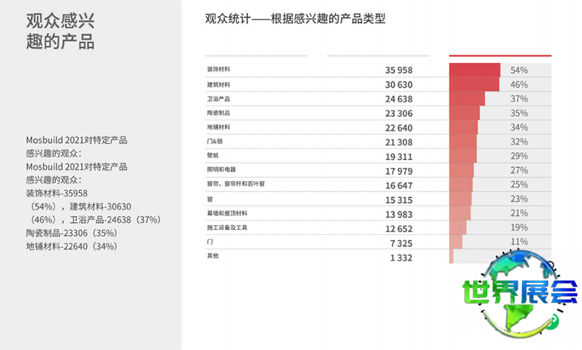 俄罗斯莫斯科建材展(MosBuild)展品划分为15个大类,覆盖建筑、建筑改造及装饰装修的全流程,例如卫生洁具、陶瓷、石材、石材加工设备、铺地材料、门及门锁、窗户及相关技术产品、家具、墙纸、涂料、照明与电气产品、窗帘及室内纺织品和五金工具等。展商产品吸引了批发商、建筑及装修公司、房地产开发商、建筑师与设计师的广泛关注。