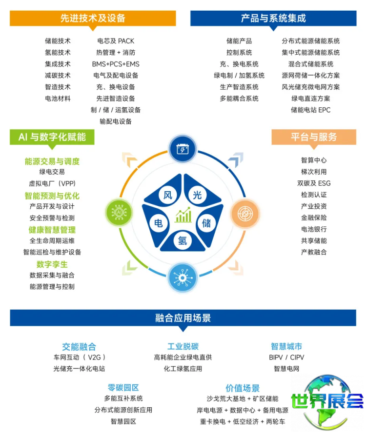 储能技术及材料:压缩空气储能、飞轮储能、抽水蓄能等物理储能技术及配套材料(如压缩机、泵、储罐等);锂离子电池:各类材料体系的动力/储能锂离子电池、固态电池及相关电池材料;液流电池:全钒液流电池、锌溴液流电池等储能技术及材料;铅酸蓄电池、铅碳电池等储能技术及材料;钠硫电池、水性钠离子电池、新型电池等化学储能技术及材料;镍氢电池及相关材料(镍带、隔膜、粘结剂、电解液等);氢储能及燃料电池:氢气制取/供应设备、氢气储存设备、加氢站、燃料电池系统及核心部件、燃料电池相关设备与装置、测试及分析仪器,燃料电池整车等;储热/储冷、熔融盐储热技术;超级电容器、超导储能等