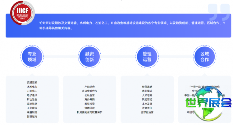 论坛研讨主题涵盖交通物流、水利电力、石油化工、矿产冶金等基础设施建设各专业方向,以及融资创新、运营管理、区域协作、市场前景等相关议题