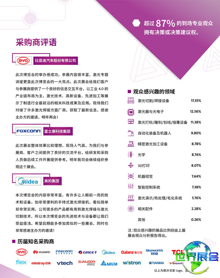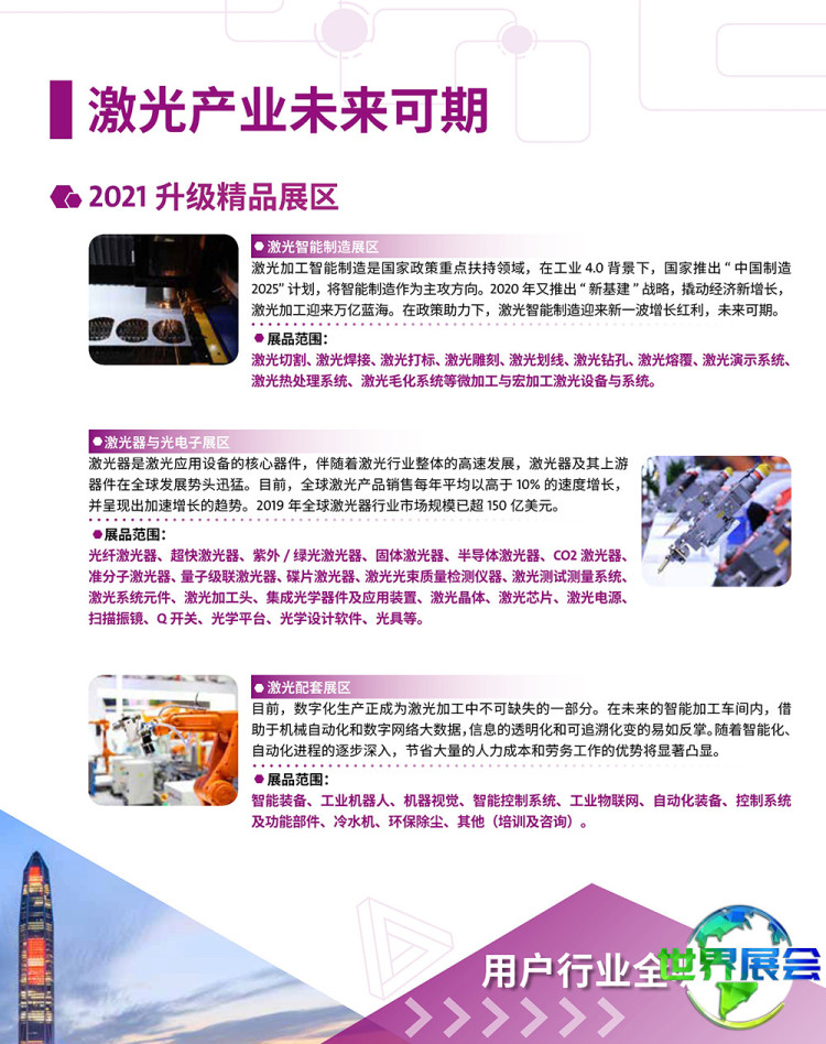 深圳国际激光技术展览会(LASERFAIR SHENZHEN)聚焦激光生产与创新应用,涵盖激光器与光电子、光学与光学制造、智能仪器、成像技术、检测与质量控制、机器人、柔性生产设备、激光加工设备、3D打印设备,并展示激光技术在汽车、金属加工、电子制造、集成电路、通信、医疗、能源、轨道交通、家电等众多行业的最新应用成果。