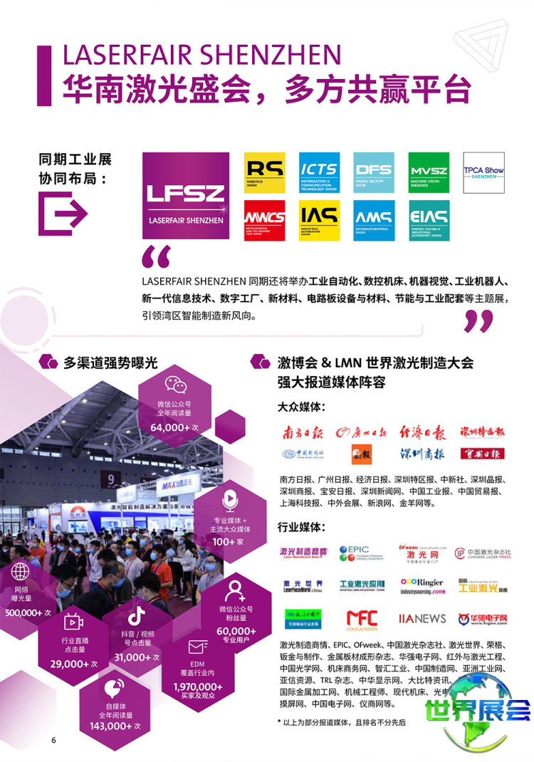 深圳国际激光技术展览会(LASERFAIR SHENZHEN)聚焦于激光技术生产及其创新应用,展示范围包括激光器与光电子、光学元件与制造、智能仪器、成像技术、检测与质控、机器人技术、柔性生产设备、激光加工设备、3D打印设备等。展会重点呈现激光技术在汽车、金属加工、电子制造、集成电路、通信、医疗、能源、轨道交通、家电等众多行业取得的最新进展。