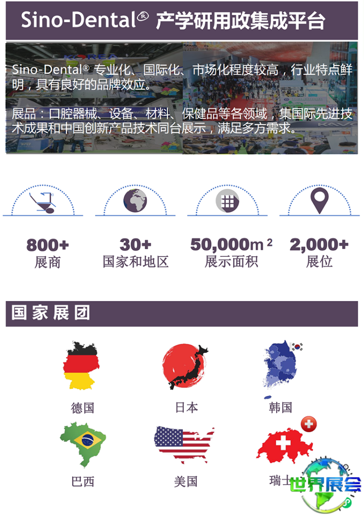 中国北京国际口腔设备材料展览会(Sino-Dental)展出面积达50000平方米,汇聚了来自德国、日本、韩国、瑞士、美国五大官方国家展团及近900家参展企业,齐聚北京展示最新的产品、技术与解决方案。展会云集了众多国内外优秀的口腔产业相关企业,是口腔专业人士不容错过的行业盛会。