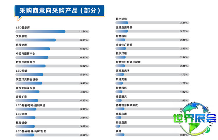 大屏幕显示技术及配套展区:小间距显示屏、Micro LED、Mini LED、常规LED显示屏(室内、户外)、OLED、液晶显示、透明屏幕、异形屏、创意显示屏、LED封装/芯片/控制系统、COB、SMD、投影设备、拼接墙、交互平板、3D显示终端、电影放映机、数字投影灯、可穿戴显示设备、投影幕布、LED配件/耗材/配套产品、LED工程安装与维护服务