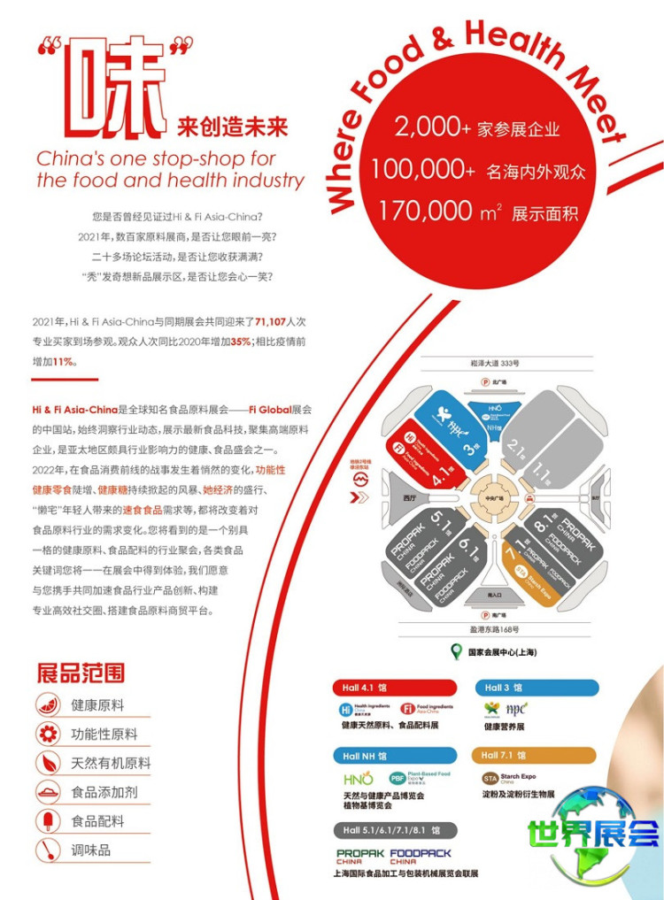 2026年中国上海国际健康天然食品原料展(Hi China)定于2026年6月15日至17日在上海国家会展中心举行。中欧世界展会网为有意向的企业提供展位预订与申请等一站式服务。