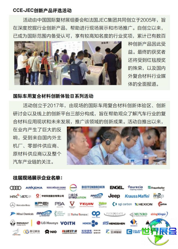 中国上海国际复合材料工业技术展CCE最大程度地映射了中国复合材料行业的发展历程,也最为精准地呈现了复合材料领域的最新发展趋势。展会现场将举办近40场关于企业最新产品与技术的专题论坛;特设国内外创新产品展示区,并由中外专家团队对创新产品进行评审颁奖;同时提供实用性强的专题技术培训,助力企业解决生产实践中遇到的具体难题。