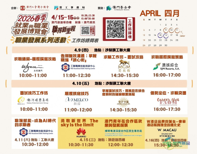 博覽會將於4月15日及16日(星期三及星期四)在澳門旅遊塔會展娛樂中心四樓舉行,每日分兩個時段開放:上午10時30分至下午1時30分、下午3時至晚上8時。有意參加的本澳居民,可從明日(31日)起至4月13日,訪問勞工局網站活動專頁:https://www.dsal.gov.mo/zh_tw/standard/spring_jobfair2026.html 進行報名,名額有限,請儘早預約。計劃參加職業發展系列活動的人士,請注意各場次的報名截止時間與活動日期,並準時參與。