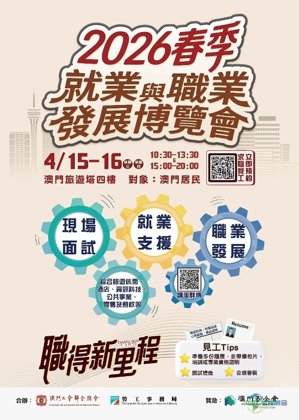 為更好推動澳門本地就業市場供需對接,助力居民規劃職業生涯,勞工事務局(簡稱“勞工局”)與澳門工會聯合總會(簡稱“工聯”)將攜手於4月15日至16日,在澳門旅遊塔會展娛樂中心四樓共同舉辦“2026春季就業與職業發展博覽會”(以下稱“博覽會”)。有興趣參與的澳門居民,可從明日(31日)起至4月13日進行線上預約登記。