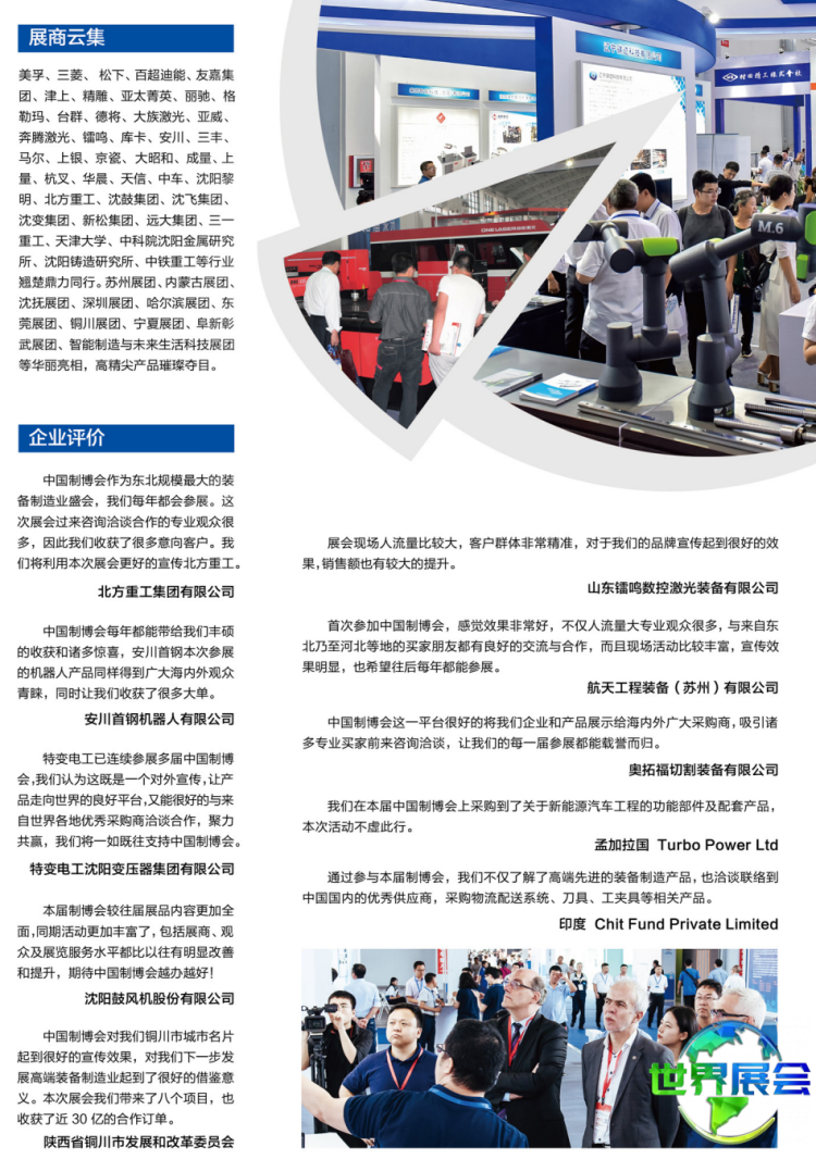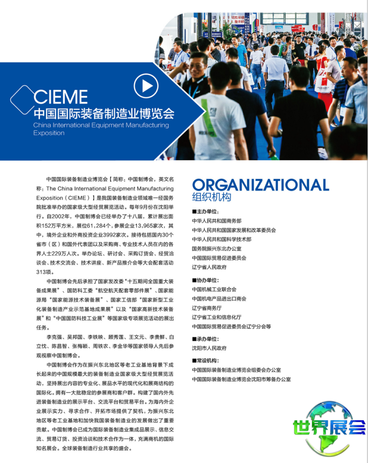 中国沈阳国际装备制造业展览会-沈阳制博会(CIEME)是东北区域规模最大、最具影响力的装备制造业专业展会。已在业内建立起显著的品牌效应,每年吸引海内外客商数万人次到场,展出各类高精尖设备数万台(套)。