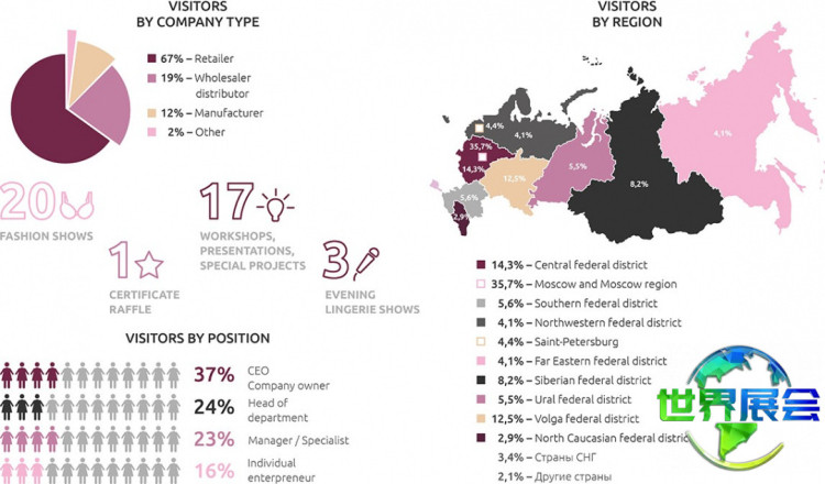 俄罗斯莫斯科内衣博览会(Lingerie Show)的观众涵盖专业连锁店/专卖店、采购团体、百货商场、进口商/大型批发商、服装制造商、自有品牌经销商等行业专业人士。展会的专业特性使其成为俄罗斯乃至独联体地区规模首屈一指的行业交流盛会,在业内享有极高声誉。