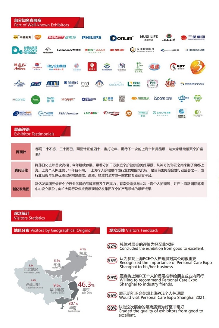 上海国际个人护理用品展览会(PCE)由中国轻工工艺品进出口商会洗涤化妆个人护理用品分会、中国口腔清洁护理用品工业协会、上海日用品行业协会共同举办。汇集全国零售分销终端买家、成品技术研发人员、国际买家和潜在客户,结合上海的地理优势,开拓个护用品市场的不二之选。