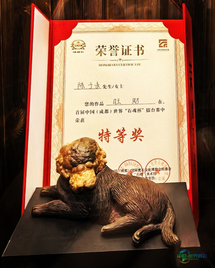 来自温江当地的奇石收藏者陈子未,以一件名为“旺财”的戈壁石精品,在众多参赛作品中拔得头筹,成功斩获特等奖,并独享“石魂杯”擂台赛十万元最高奖金。