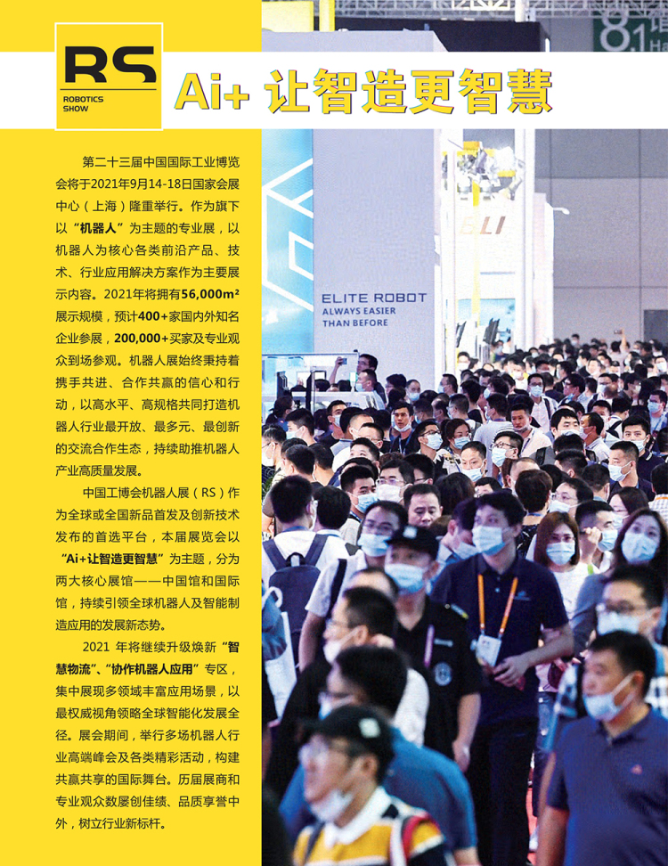 上海国际机器人展览会(RS)从2012年设立机器人展区,2013年首次独立设主题展为工业机器人展,2015年更名为机器人展,2016年首次在展内设立服务机器人体验专区和高校科研创新展示区,2017年设立“中国馆”和“国际馆”,到2018年深化“中国馆”和“国际馆”主题",已成为机器人行业风向标、持续引领行业发展新趋势。