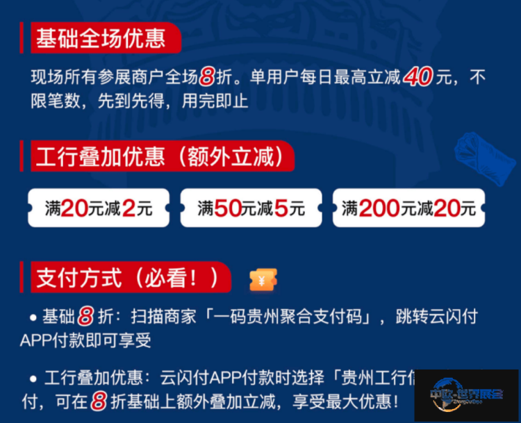 在食博会现场消费时,使用「一码贵州聚合码+云闪付」支付,即可享受8折消费券优惠,单用户每日累计最高可减40元,优惠次数不设上限,福利先到先得。