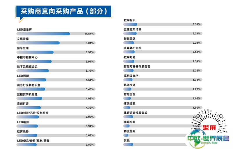 大屏幕显示技术及配套展区:小间距屏、Micro LED、Mini LED、常规LED显示屏(室内、室外)、OLED、液晶显示、透明屏、异型屏、创意屏、LED封装/芯片/控制系统、COB、SMD、投影机、拼接墙、交互平板显示屏、3D显示终端、电影放映机、数字投影灯、可穿戴显示器、投影屏幕、LED备品/备件/耗材/配套、LED工程安装与维护修理