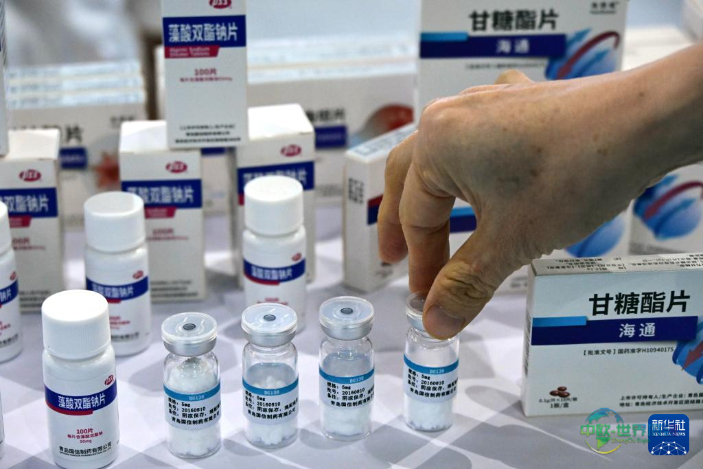 9月8日,工作人员在海洋生物医药展区向观众讲解展品。