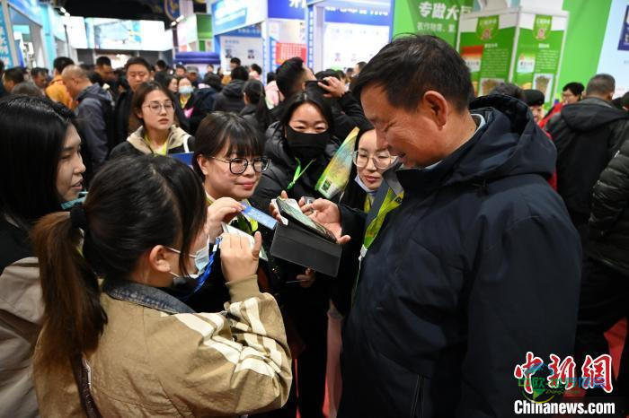 3月26日,在内蒙古呼和浩特市,企业与客户互相交换联系方式。当日,第三十六届内蒙古农业博览会在内蒙古国际会展中心开幕。展会总展出面积为5万平方米,展位超过1500个,来自全国28个省区市的900余家企业及科研单位参与了展览。中新社记者 刘文华 摄