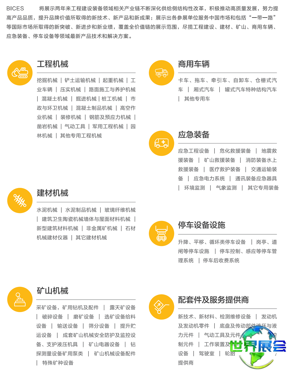 配套件及服务商:创新技术与材料、检测维修设备、发动机及其零部件、底盘与传动部件、液压与液力元件、气动元件与工具、电子电气控制元件、工作装置与机构、密封件、润滑设备、驾驶室、轮胎、座椅、各类服务提供商